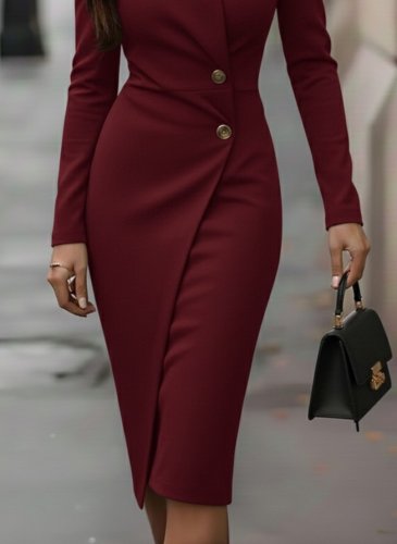 • Kadın uzun kollu yandan düğmeli kruvaze yaka detaylı midi ithal krep elbise