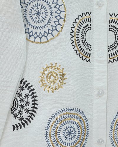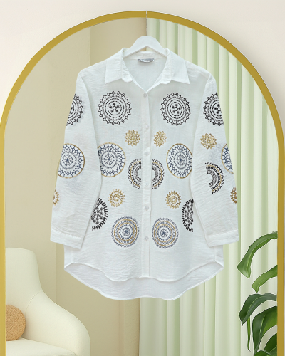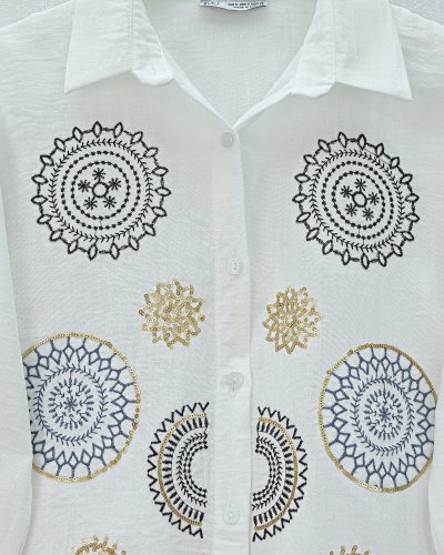 • Kolu Ve Önü Nakış İşlemeli Düğmeli Keten Gömlek Beyaz