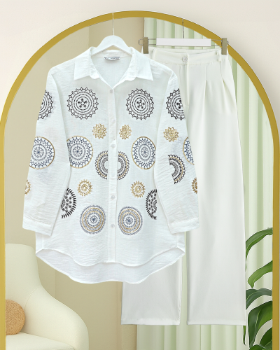 Kolu Ve Önü Nakış İşlemeli Düğmeli Keten Gömlek Beyaz