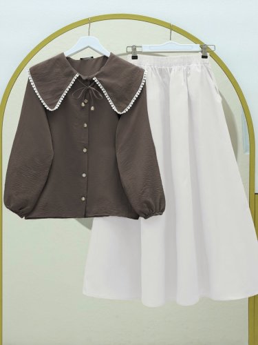 Bebe Yaka Dantelli Kolu Lastikli Gömlek Kahve
