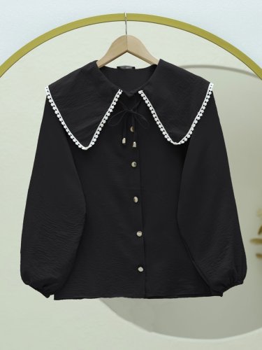 Bebe Yaka Dantelli Kolu Lastikli Gömlek Siyah