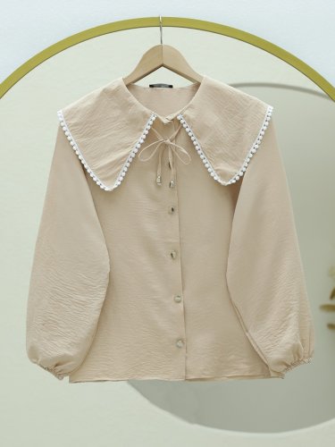 Bebe Yaka Dantelli Kolu Lastikli Gömlek Vizon